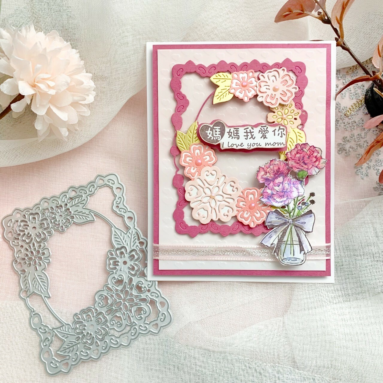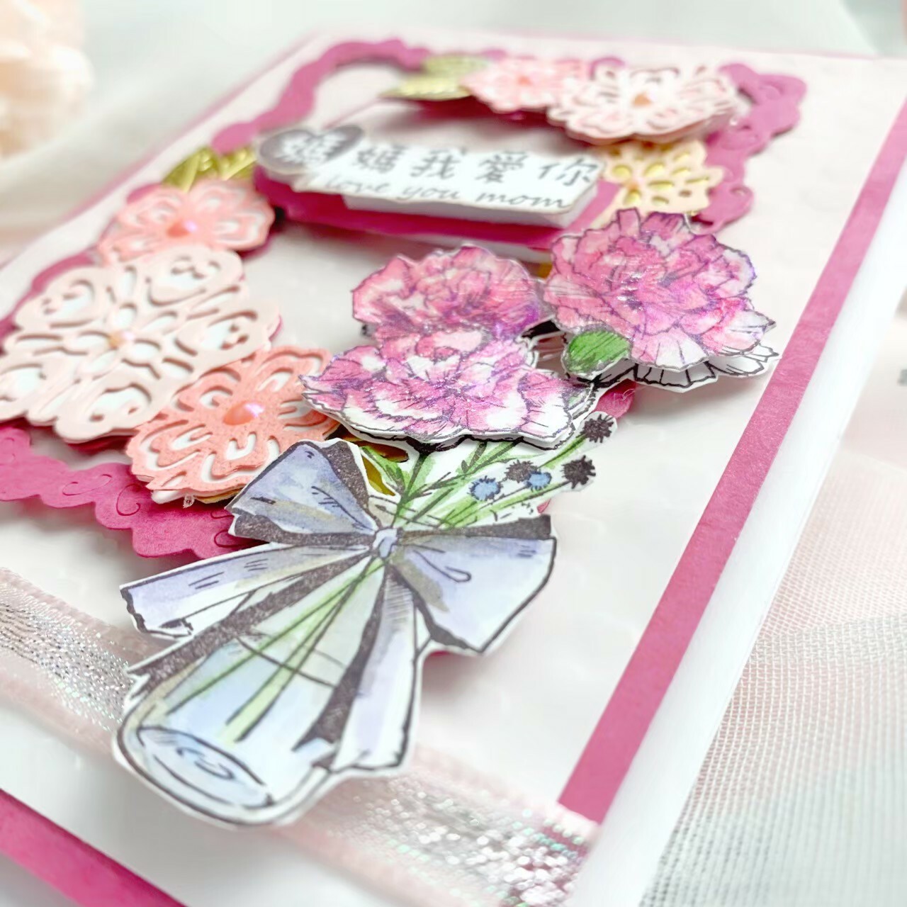 楓木印章-康乃馨花瓶,楓木印章-媽媽我愛你,搭配印台蓋圖上色後剪下來,照步驟1~3依序組合黏貼立體或平面。