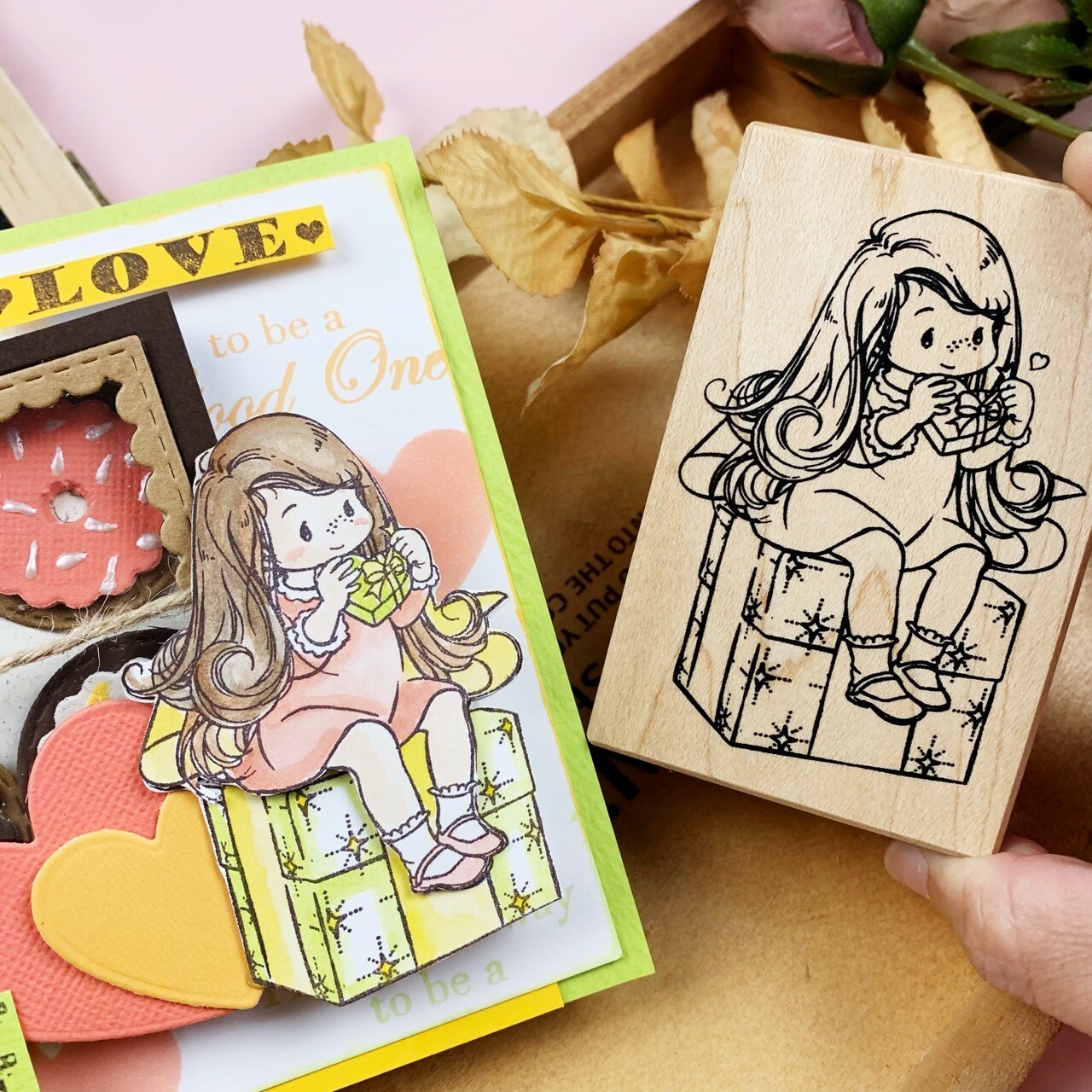 用印章『坐在禮物上的女孩-貨號:GT-5575』蓋圖並上色後剪輪廓。