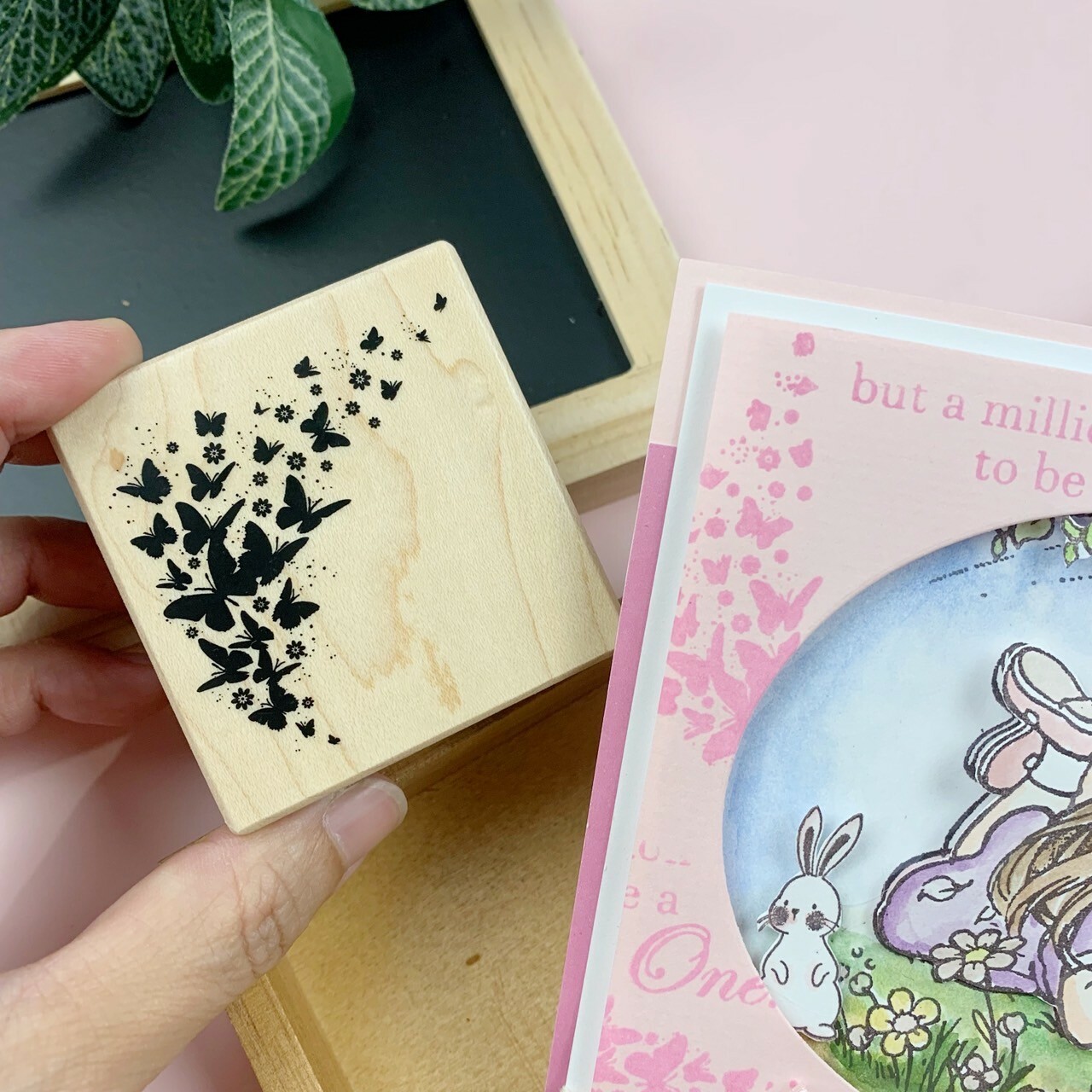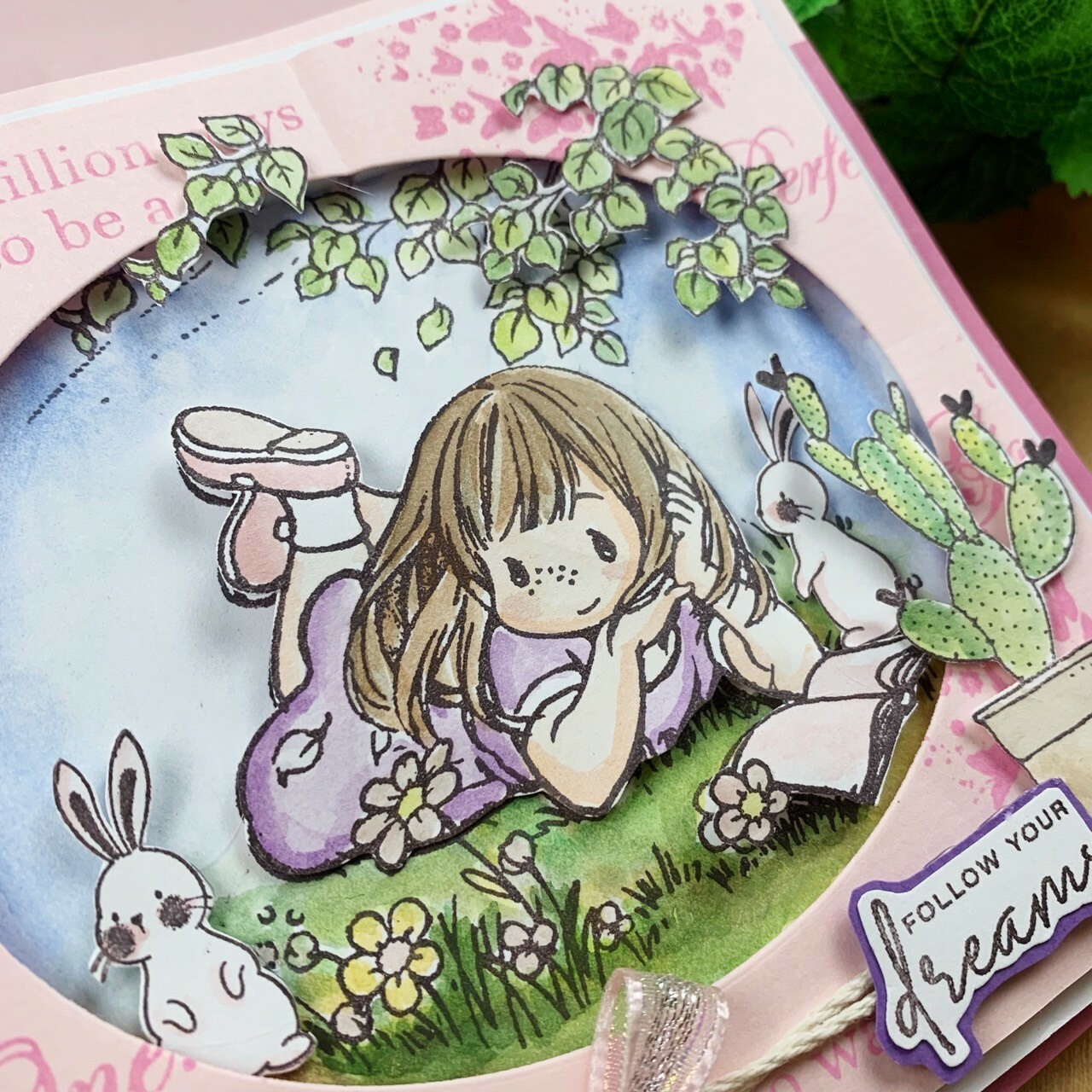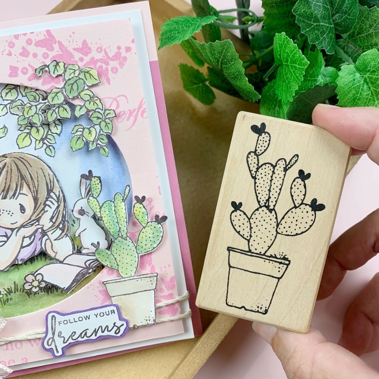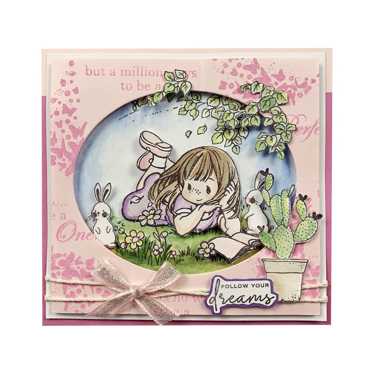 1-白-13x12.5公分紙張中間用『草地上閱讀的女孩印章-貨號: KT-4737』蓋圖後上色。