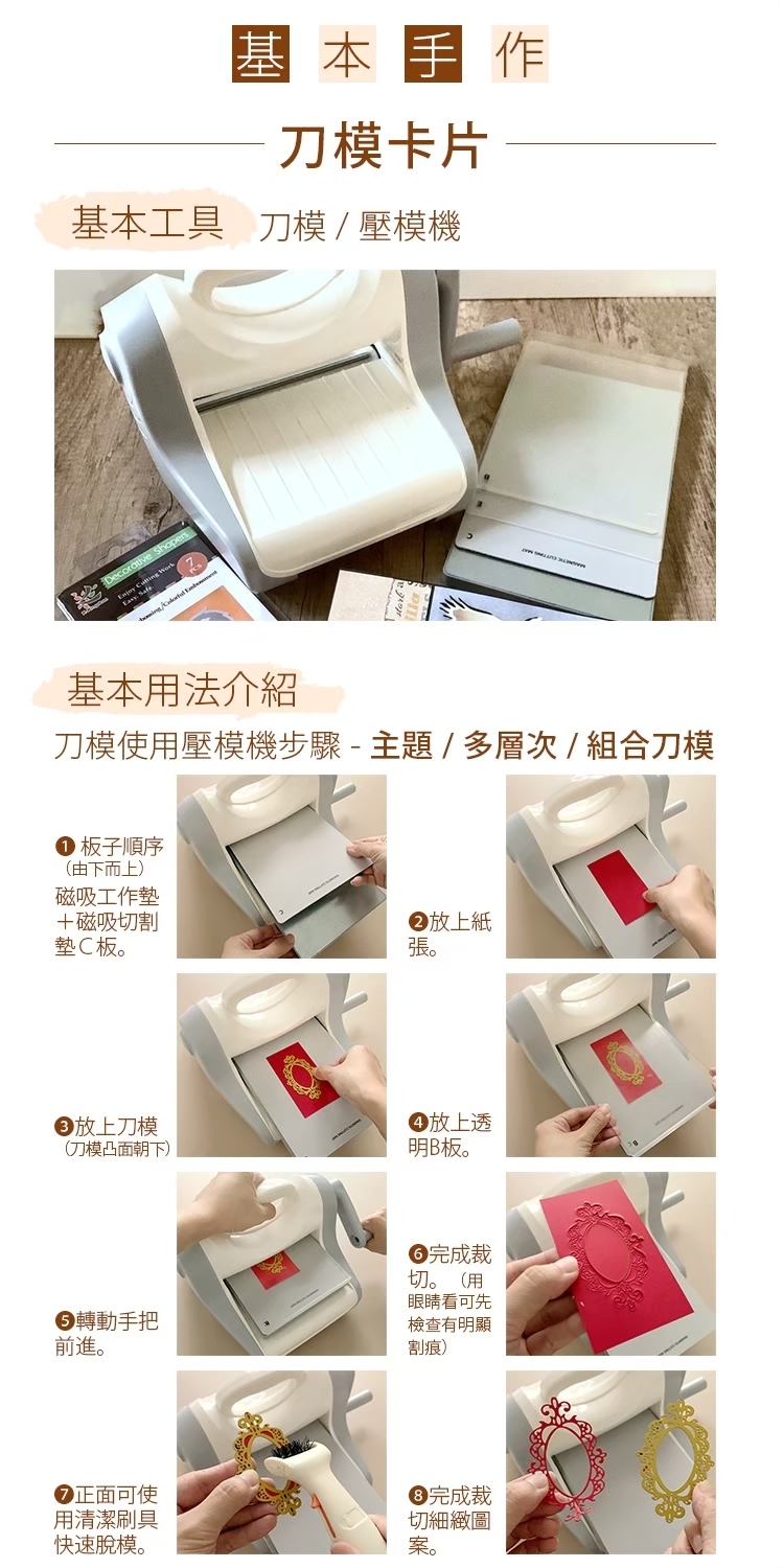 • 使用方式:將主題刀模片與卡紙搭配使用壓模機裁切、部分圖樣可做出浮雕,是玩拼貼、做手工卡的好幫手。